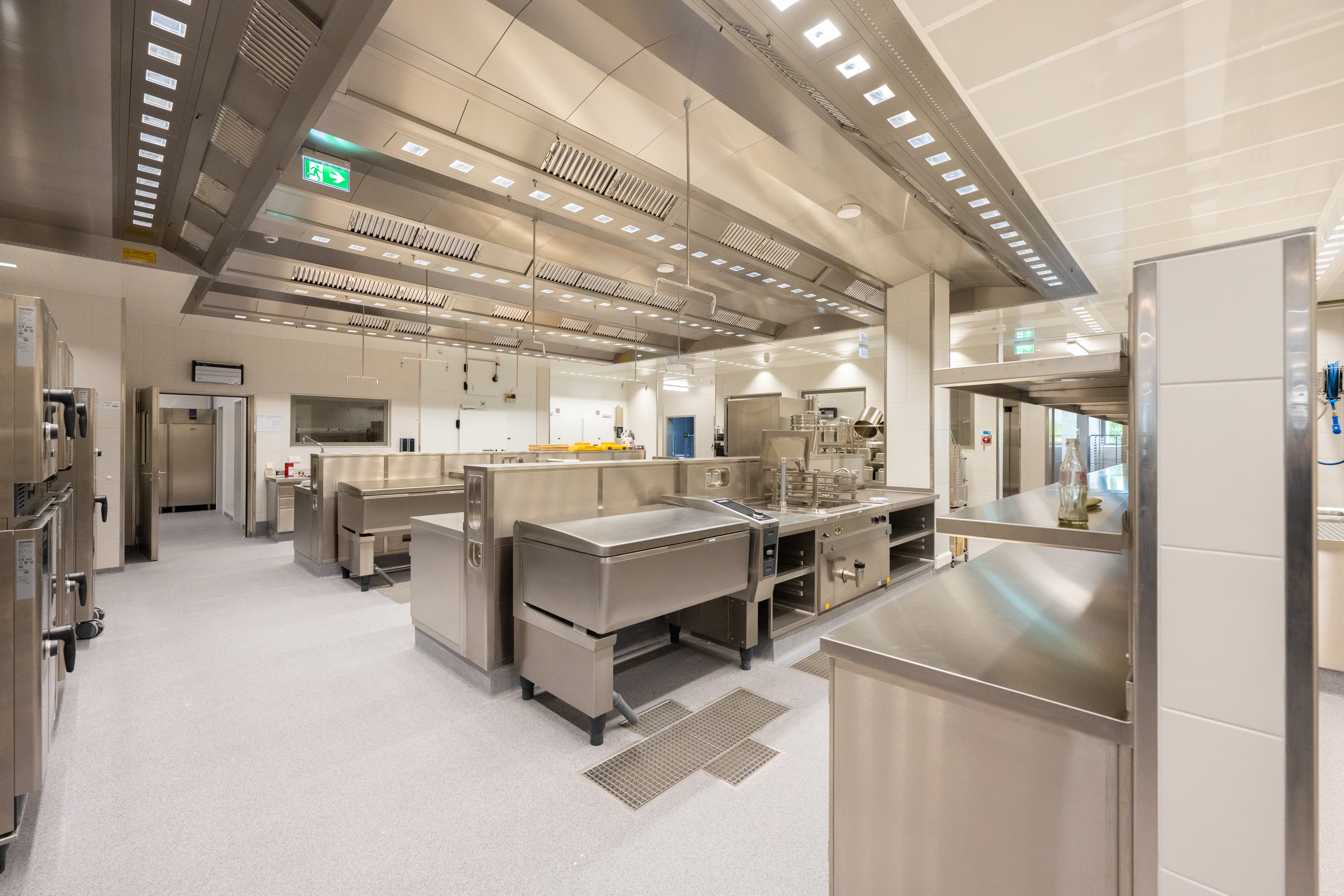 Herzstück des Gebäudes ist im Erdgeschoß das Betriebsrestaurant. Hier werden täglich bis zu 2.000 Essen frisch zu bereitet. Den Mitarbeitenden werden eine große Auswahl an täglich wechselnden Gerichten auf Restaurantniveau geboten.